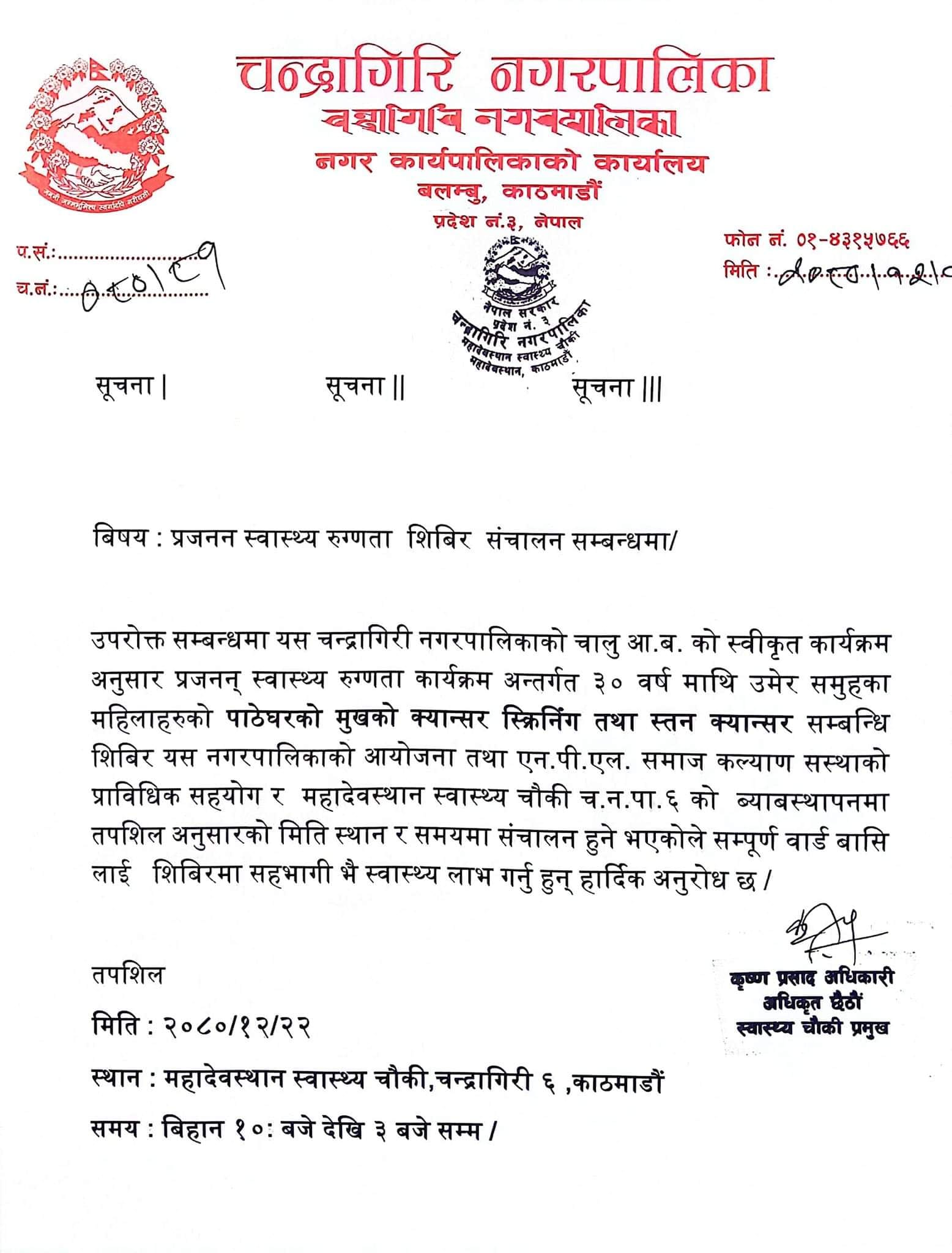 चन्द्रागिरि नगरपालिकाको आयोजनामा भोलि (चैत्र २२ गते) बिहीबार महिलाहरूका लागि लक्षित गरी स्वास्थ्य शिविर सञ्चालन हुने भएको छ ।