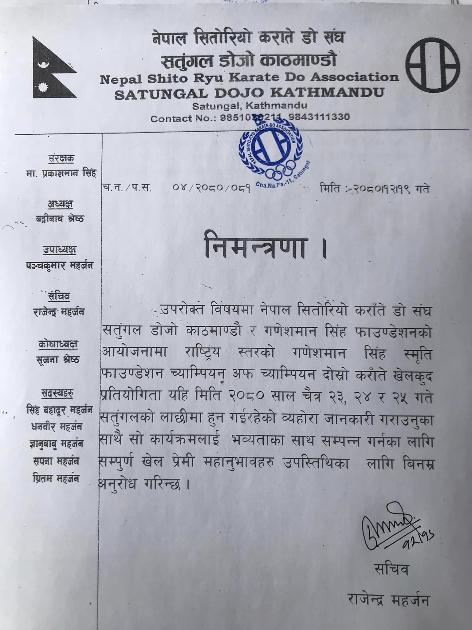 चैत्र २३ गते सुरु हुने गणेशमान सिंह स्मृति फाउण्डेशन च्याम्पियन अफ च्याम्पियन दोश्रो कराँते खेलकुद प्रतियोगिता चैत्र २५ गते समापन हुने नेपाल सितोरियो कराँते डो संघ, सतुगंल डोजोका सचिव राजेन्द्र महर्जनले जानकारी दिनुभयो ।