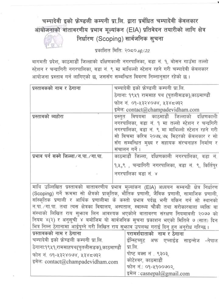 चम्पादेवी केबलकारको प्रवर्द्धक चम्पादेवी इको फ्रेण्डली कम्पनी प्रालिले बिहीबार एक सार्वजनिक सूचना जारी गर्दै सात दिन भित्र केबलकार परियोजना प्रभावित क्षेत्रका स्थानीयहरूबाट केबलकार परियाेजना सन्दर्भमा लिखित राय सुझाव माग गरेको छ ।