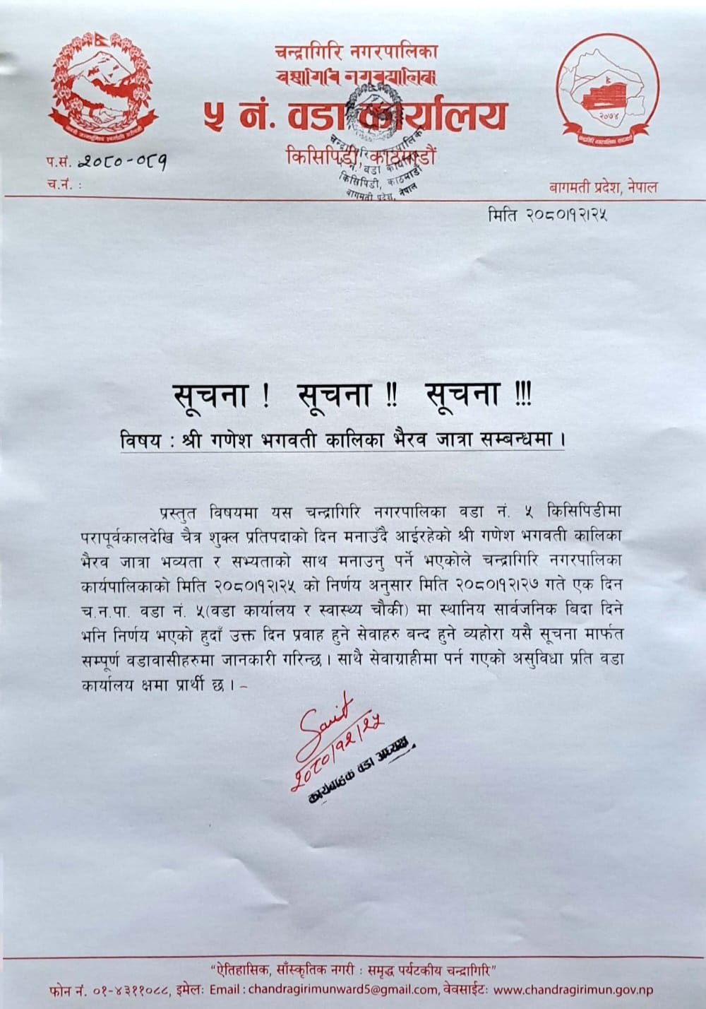श्री गणेश भगवति कालिका भैरव जात्राका अवसरमा चन्द्रागिरि नगरपालिका वडा नंं ५ महादेवस्थान, किसिपिडीले चैत्र २७ गते मंगलबार वडा क्षेत्रमा स्थानीय सार्वजनिक बिदा दिने भएको छ ।