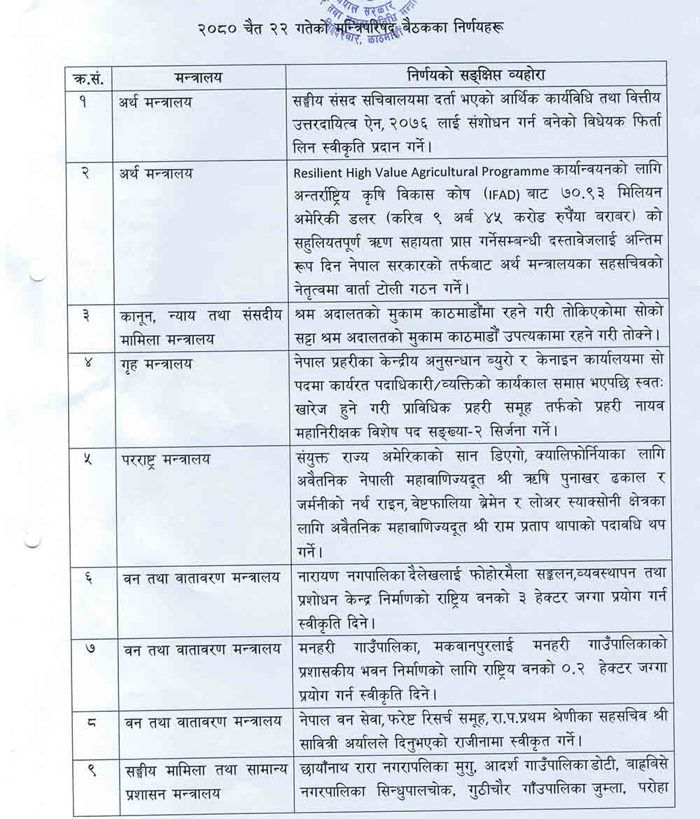 यस्ता छन् २०८० चैत्र २२ गते बसेको मन्त्रीपरिषद् बैठकका निर्णयहरूः