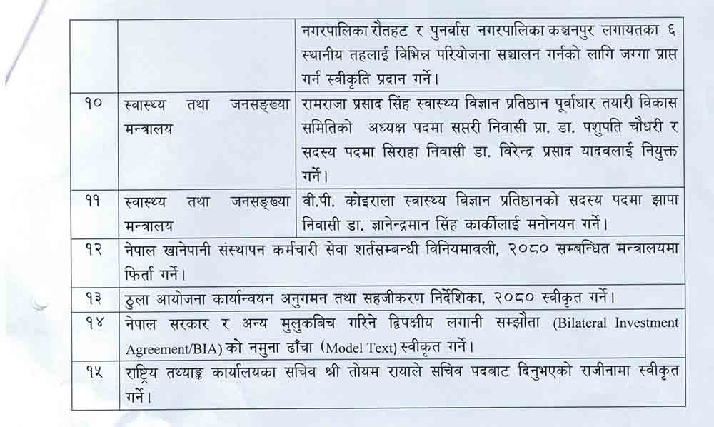यस्ता छन मन्त्रिपरिषद बैठकका १५ निर्णयहरू