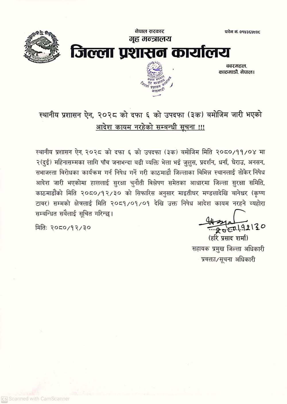 प्रशासनले हाललाई सुरक्षा चुनौती विश्लेषणको आधरमा निषेधाज्ञा हटाएको बताएको छ ।