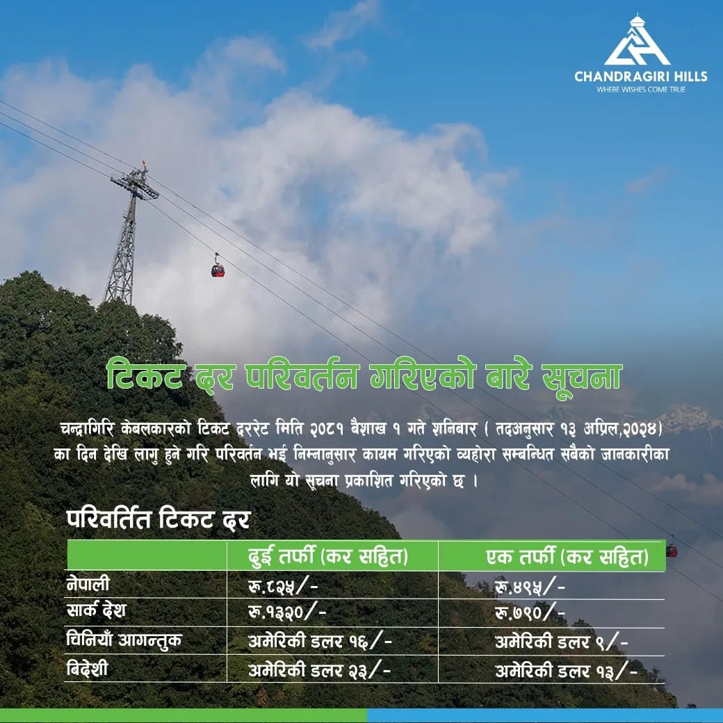 चन्द्रागिरि हिल्सका अनुसार अब केबलकारमा दुईतर्फी यात्रा गर्ने चाहने नेपाली नागरिकहरूले टिकट मूल्य बापत ८२५ रूपैयाँ तिर्नुपर्नेछ । यसअघि सो टिकटको मूल्य ७९९ रूपैयाँ रहेको थियो ।