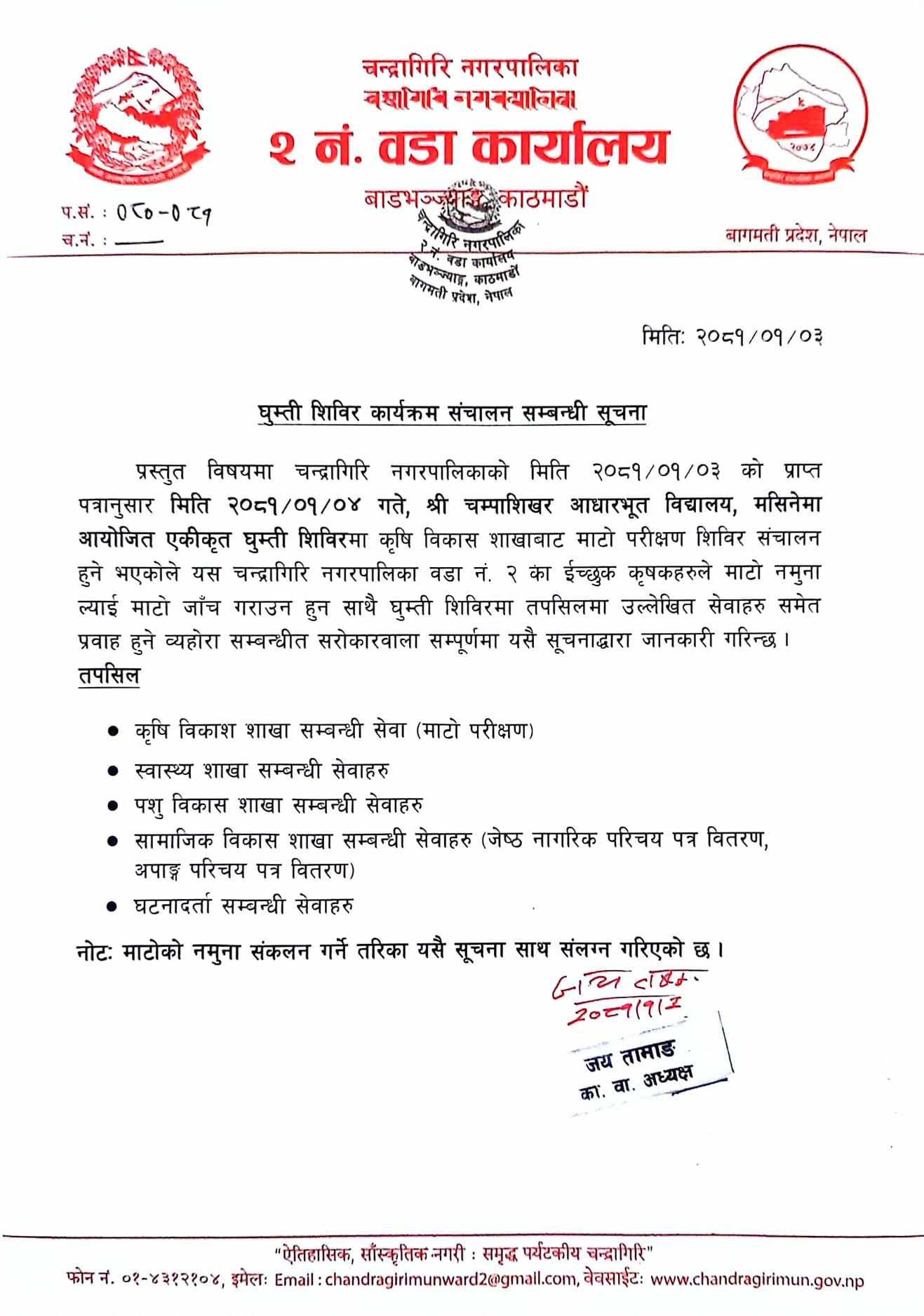 चन्द्रागिरि नगरपालिकाले आज मंगलबार चन्द्रागिरि नगरपालिका-२ वाणभञ्ज्याङको मसिनेमा गाउँमा एकीकृत घुम्ती शिविर सञ्चालन गर्दैछ ।