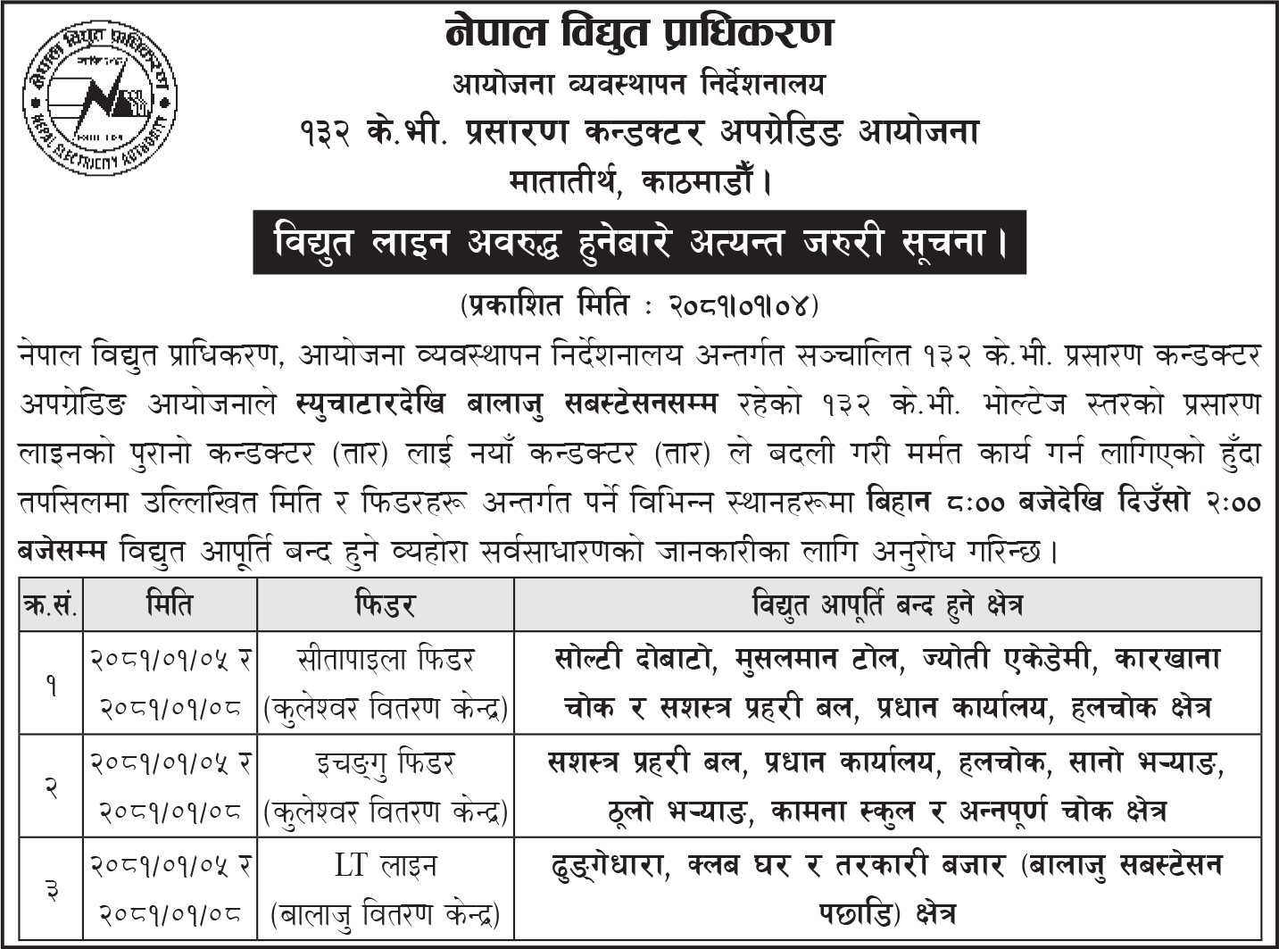 विद्युत् प्राधिकरणले मंगलबार सूचना जारी गर्दै प्रसारण कन्डक्टर अपग्रेडिङ आयोजनाले स्युचाटारदेखि बालाजु सब स्टेसनसम्म रहेको १३२ केभी भोल्टेज स्तरको प्रसारण लाइनको पुरानो कन्डक्टर (तार) लाई नयाँ कन्डक्टर (तार) ले बदली गरी मर्मत कार्य गर्न लागिएको हुँदा बिहान ८ बजेदेखि दिउँसो २ बजेसम्म बिजुली अवरुद्ध हुने भएको जानकारी दिएको छ ।
