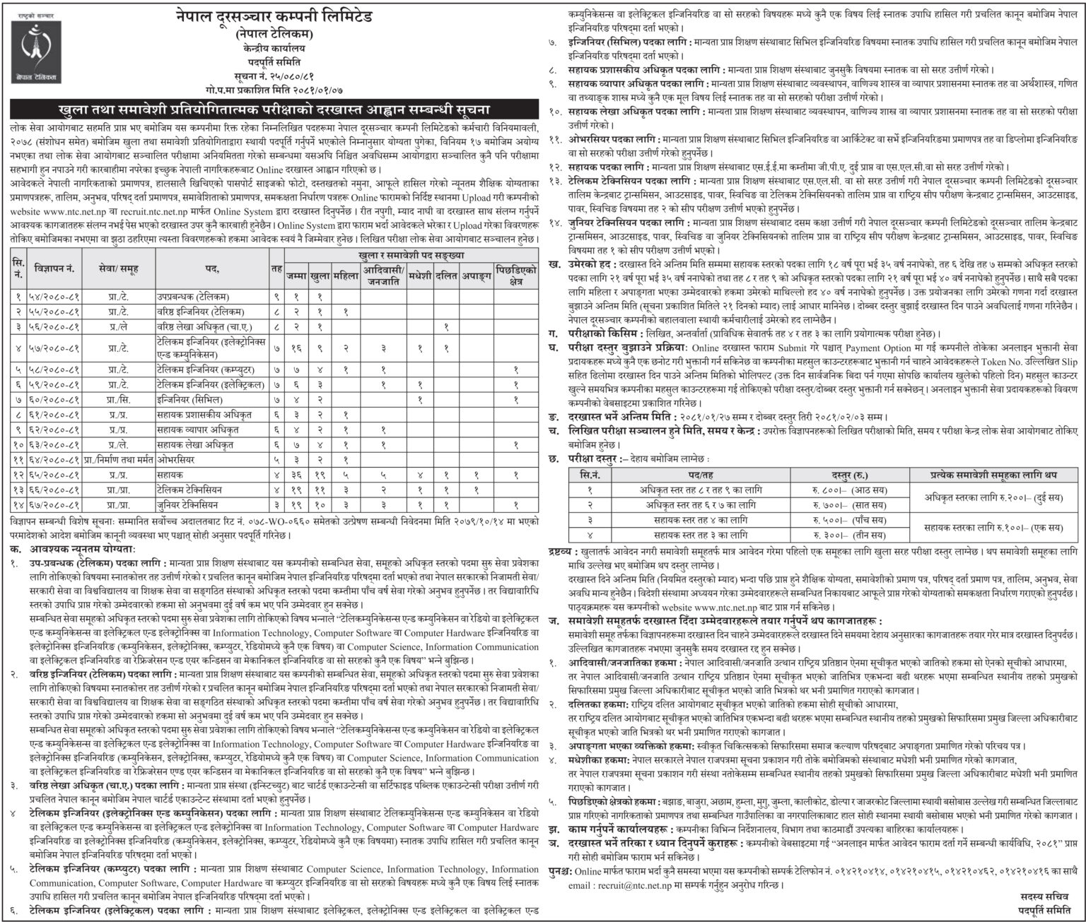 नेपाल दूरसञ्चार कम्पनी लिमिटेड (नेपाल टेलिकम)ले विभिन्न तहमा पदपूर्तिका लागि दरखास्त आह्वान गरेको छ ।