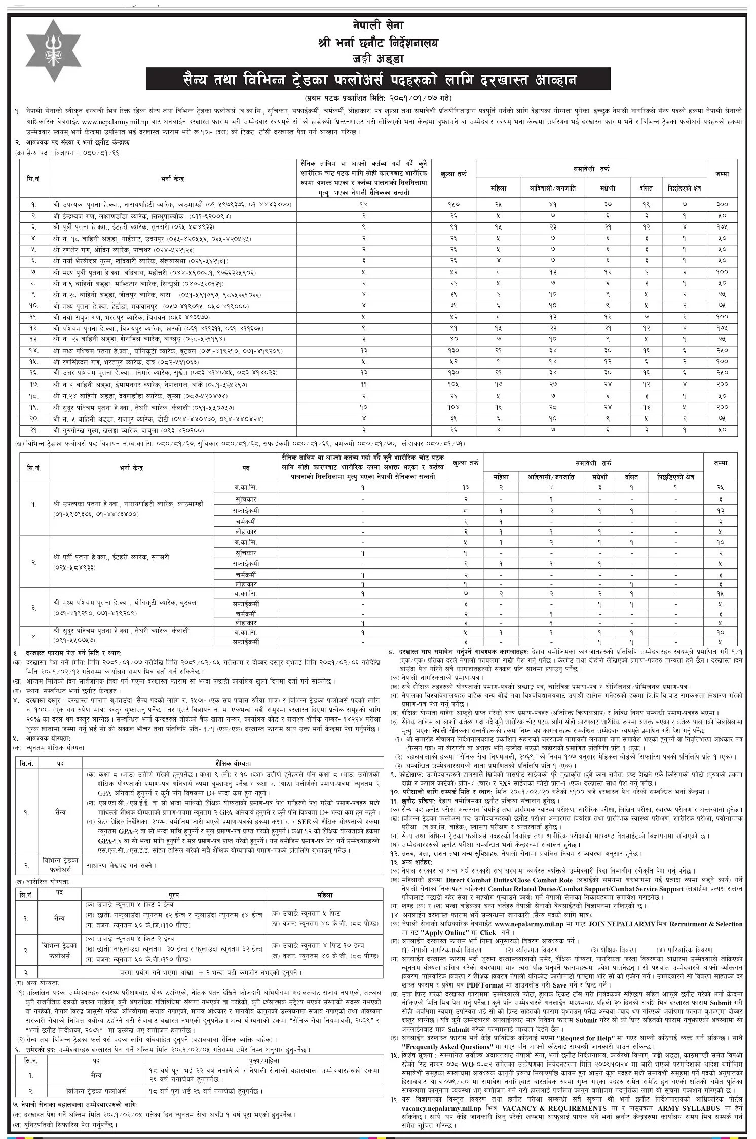 नेपाली सेनाको स्वीकृत दरबन्दीभित्र रिक्त रहेका सैन्य तथा विभिन्न ट्रेडका फलोअर्स (ब.का.सि., सुचिकार, सफाईकर्मी, चर्मकर्मी, लोहाकार) पदमा खुला तथा समावेशी प्रतियोगिताद्वारा पदपूर्ति गरिने सूचनामा उल्लेख छ ।