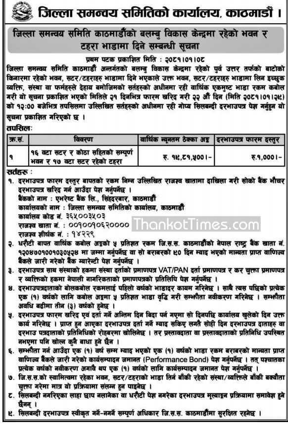 वार्षिक १९ लाख ८१ हजार ५ सय रूपैयाँ न्यूनतम ठेक्का अंक रहने गरी कार्यालयले भाडाका लागि ठेक्का आह्वान गरेको हो ।