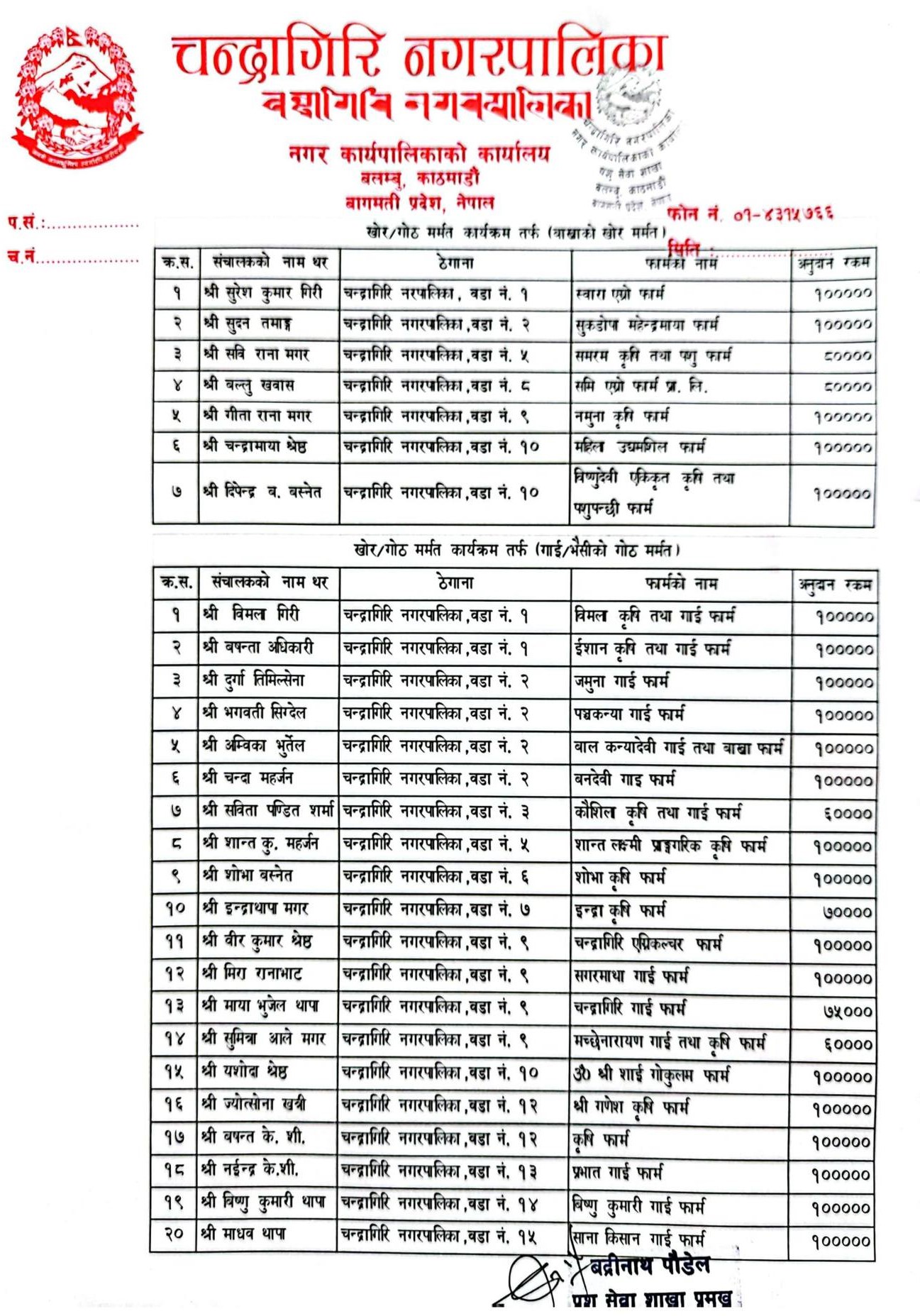 चन्द्रागिरि नगरपालिकाले चालु आर्थिक वर्षको स्वीकृत कार्यक्रम अनुसार मलखाद व्यवस्थापन तथा खोर गोठ मर्मत कार्यक्रमका लागि नगर क्षेत्रका ५० वटा कृषि फार्मलाई नगद अनुदान दिने भएको छ ।