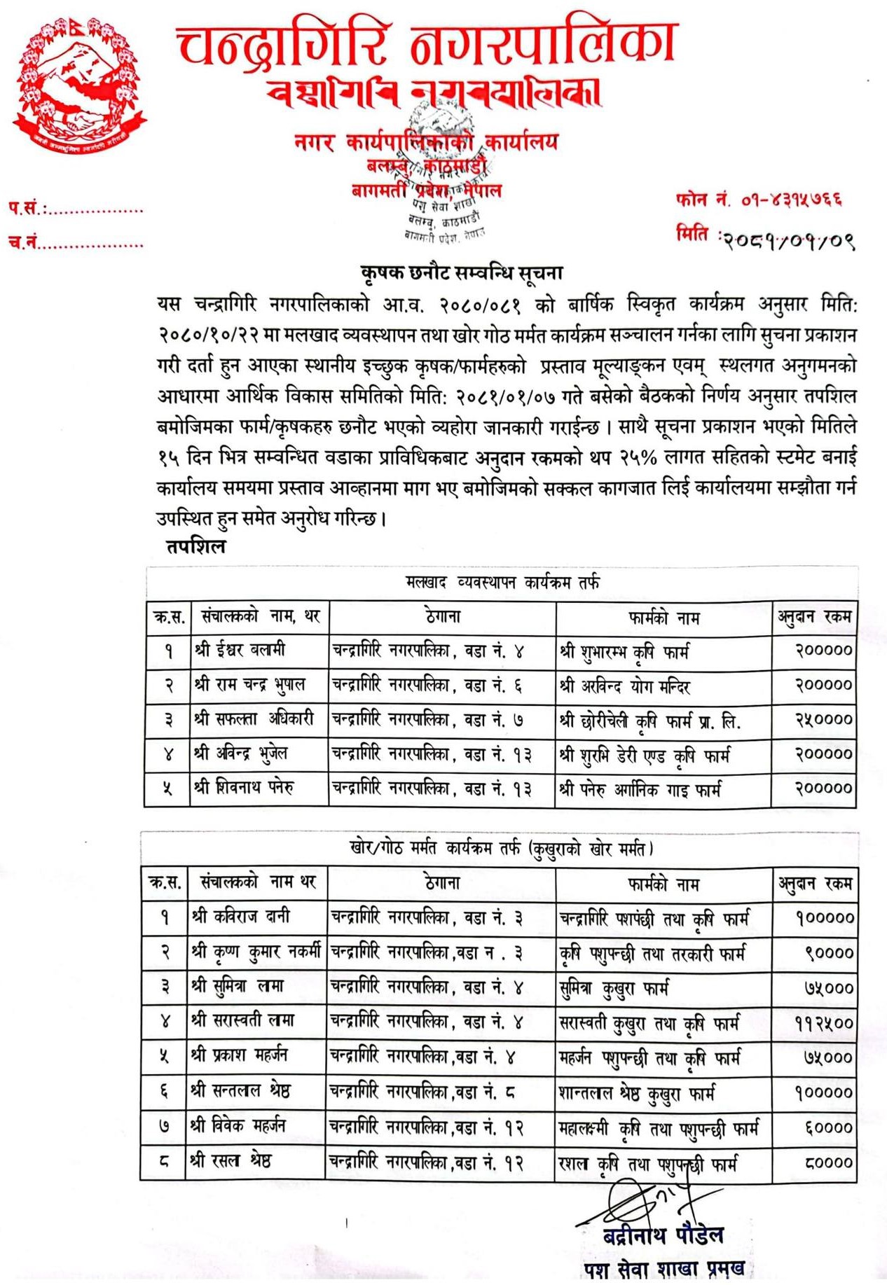 चन्द्रागिरि नगरपालिकाले चालु आर्थिक वर्षको स्वीकृत कार्यक्रम अनुसार मलखाद व्यवस्थापन तथा खोर गोठ मर्मत कार्यक्रमका लागि नगर क्षेत्रका ५० वटा कृषि फार्मलाई नगद अनुदान दिने भएको छ ।