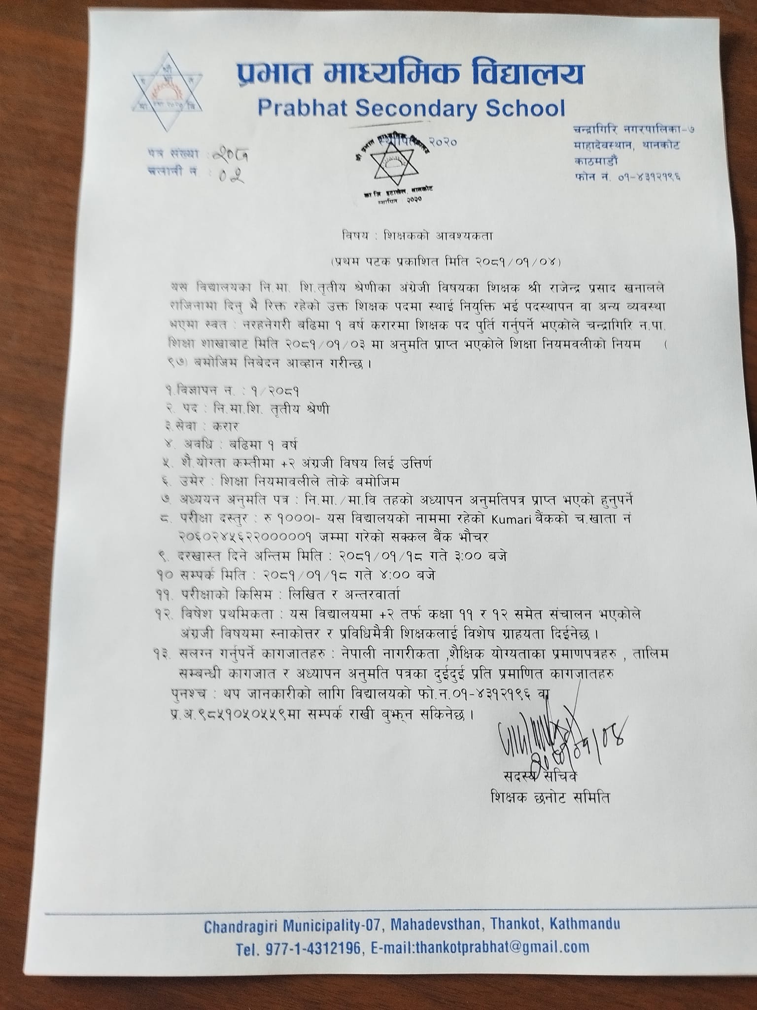 विद्यालयले सूचना जारी गर्दै बढीमा १ वर्ष अवधिका लागि करार सेवामा अंग्रेजी शिक्षण शिक्षक माग गरेको हो ।