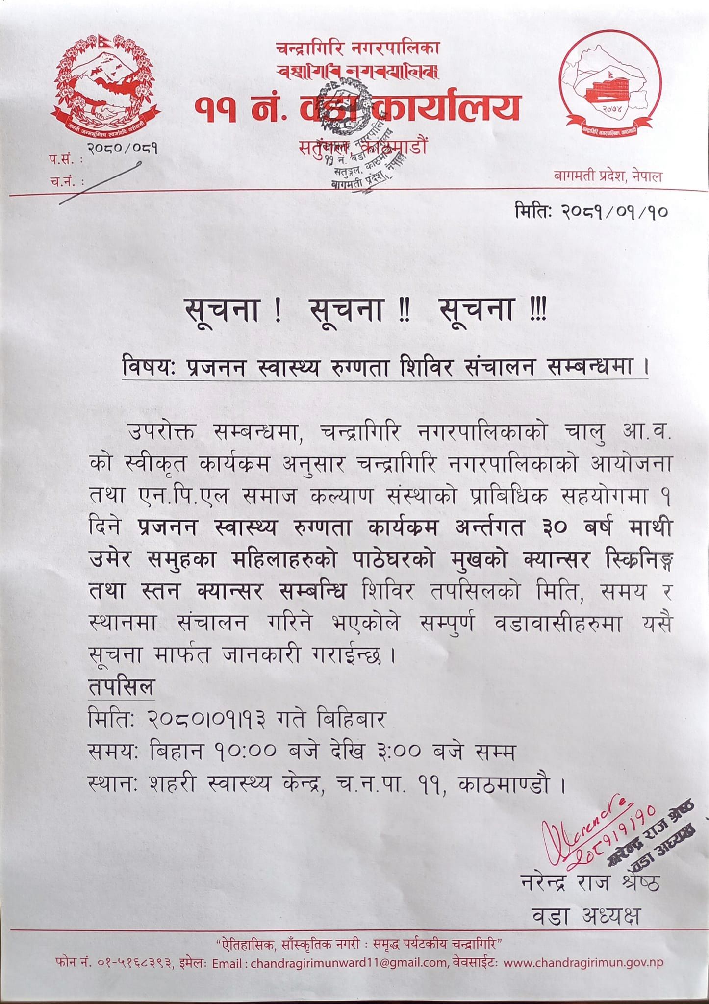 चन्द्रागिरि नगरपालिकाको आयोजनामा आज बिहीबार महिलाहरूका लागि लक्षित गरी स्वास्थ्य शिविर सञ्चालन हुँदैछ ।