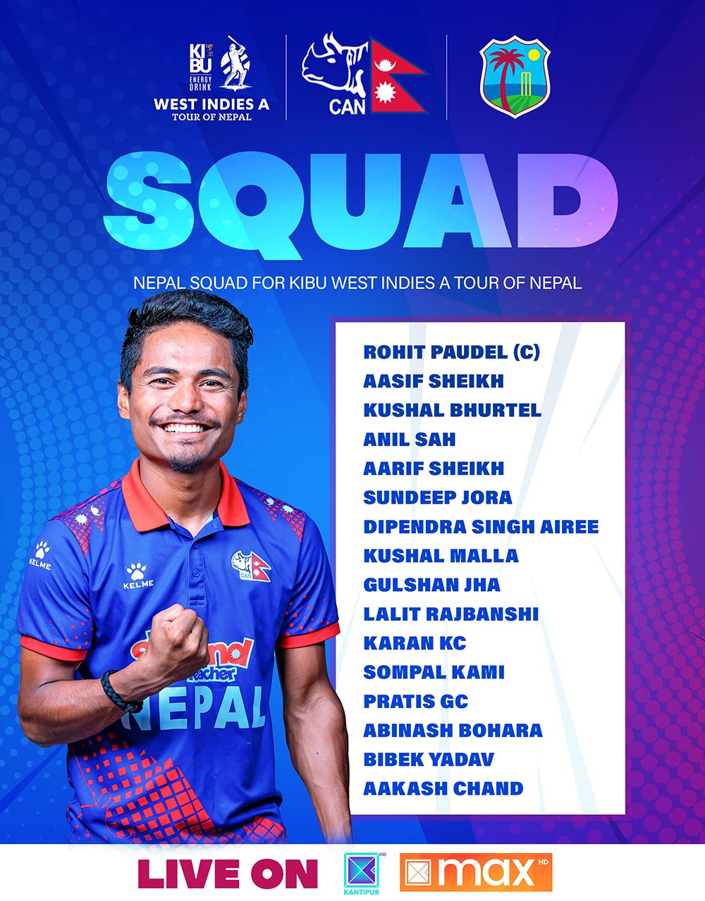 नेपाल क्रिकेट संघ (क्यान) ले रोहित पौडेलको कप्तानीमा १६ सदस्यीय टिमको घोषणा गरेको हो ।