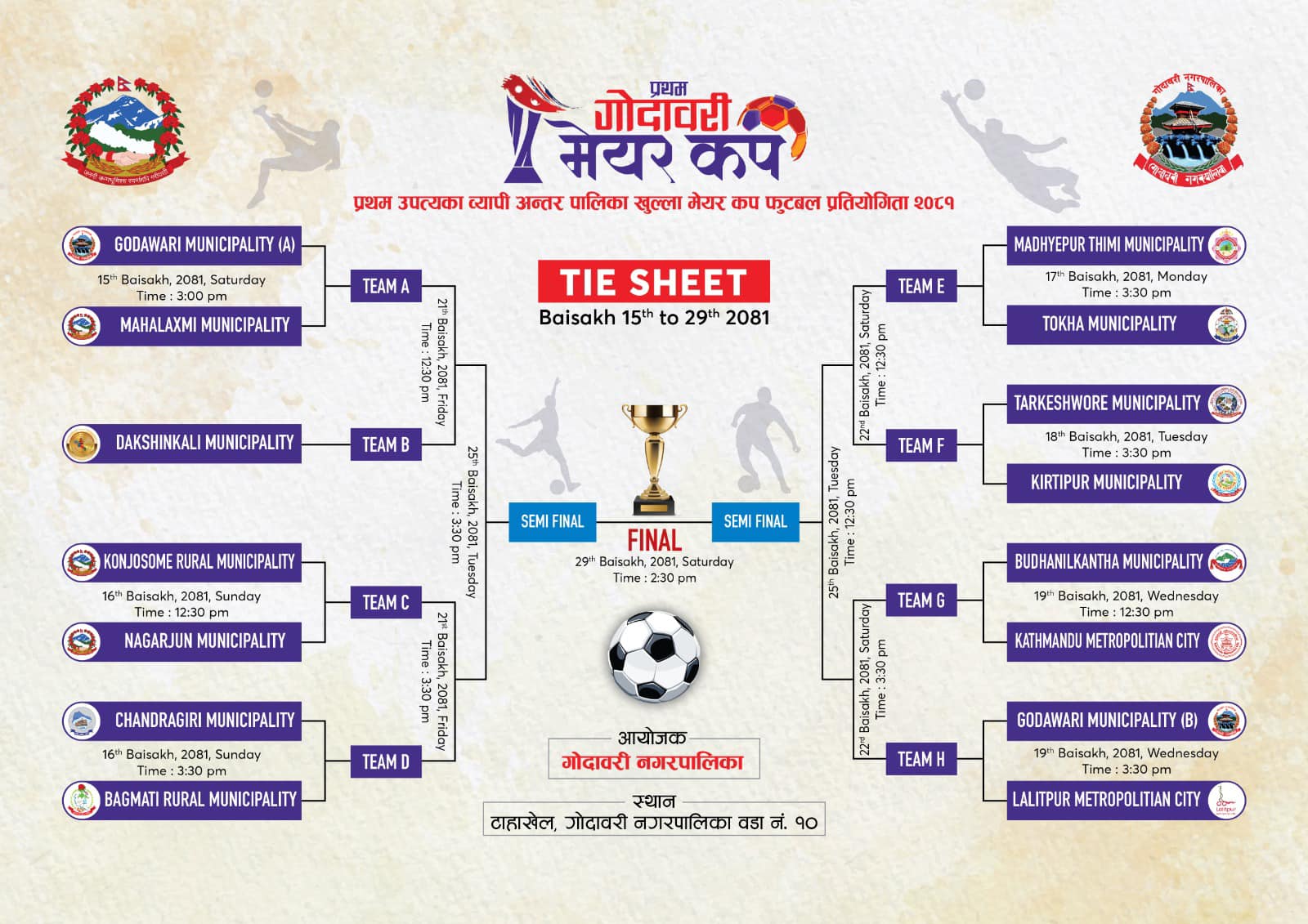 प्रतियोगिता अन्तर्गत शनिबार सम्पन्न उद्घाटन खेलमा आयोजक गोदावरी नगरपालिका ए टीम छिमेकी महालक्ष्मी नगरपालिकासँग ट्राइबेकरमा ४-२ ले स्तब्ध बन्यो । खेलको निर्धारित सम दुवै टोलीबाट कुनै गोल हुन नसकेपछि नतिजा सडेन डेथमा निकालिएको थियो । जितसँगै महालक्ष्मी प्रतियोगिताको क्वाटरफाइनलमा पुगेको छ । सेमीफाइनल प्रवेशका लागि महालक्ष्मीले बैशाख २१ गते दक्षिणकाली नगरपालिकाको सामना गर्नेछ । दक्षिणकाली बाइ पाउँदै सिधै क्वाटरफाइनलका लागि छानिएको हो ।