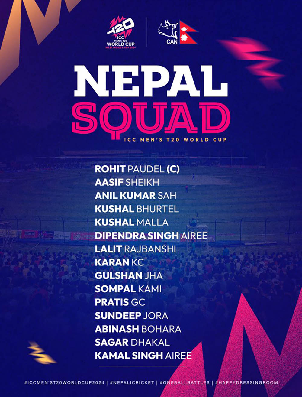 नेपाल क्रिकेट संघ (क्यान) ले आगामी जुन १ देखि २९ सम्म अमेरिका र वेस्ट इन्डिजमा हुने टी-२० विश्वकपका लागि रोहित पौडेलको कप्तानीमा १५ सदस्यीय टिमको घोषणा गरेको हो ।