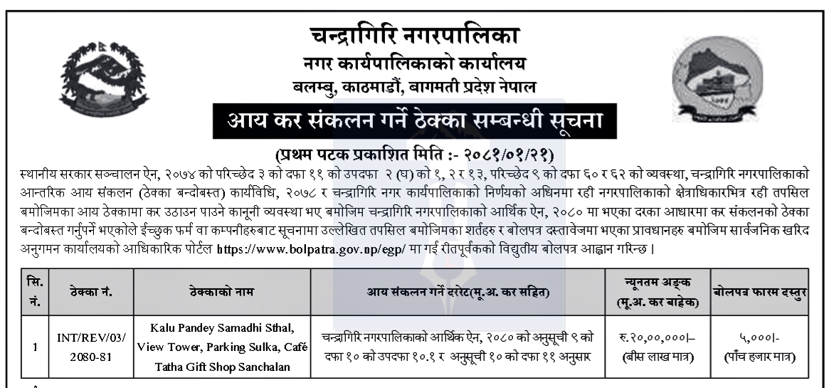 स्थानीय सरकार सञ्चालन ऐन २०७४ को परिच्छेद ३ को दफा १९ को उपदफा २ घ को १, २, र १३, परिच्छेद ९ को दफा ६० र ६२ को व्यवस्था , चन्द्रागिरि नगरपालिकाको आन्तरिक आय संकलन (ठेक्का बन्दोबस्त) कार्यविधि, २०७८ र चन्द्रागिरि नगरपालिका कार्यपालिकाको निर्णयको अधिनमा रही नगरपालिकाको क्षेत्राधिकारभित्र रही सो ठेक्का आह्वान गरिएको चन्द्रागिरि नगरपालिकाले जनाएको छ ।