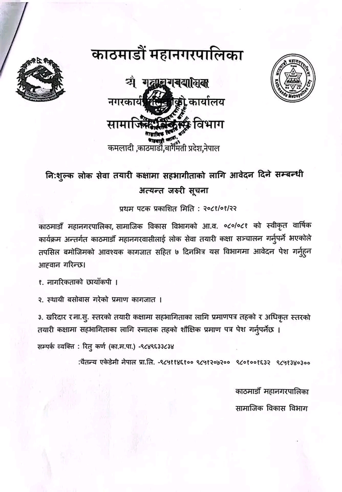काठमाडौं महानगरपालिकाले नि:शुल्क लोक सेवा तयारी कक्षाहरू सञ्चालन गर्ने भएको छ ।