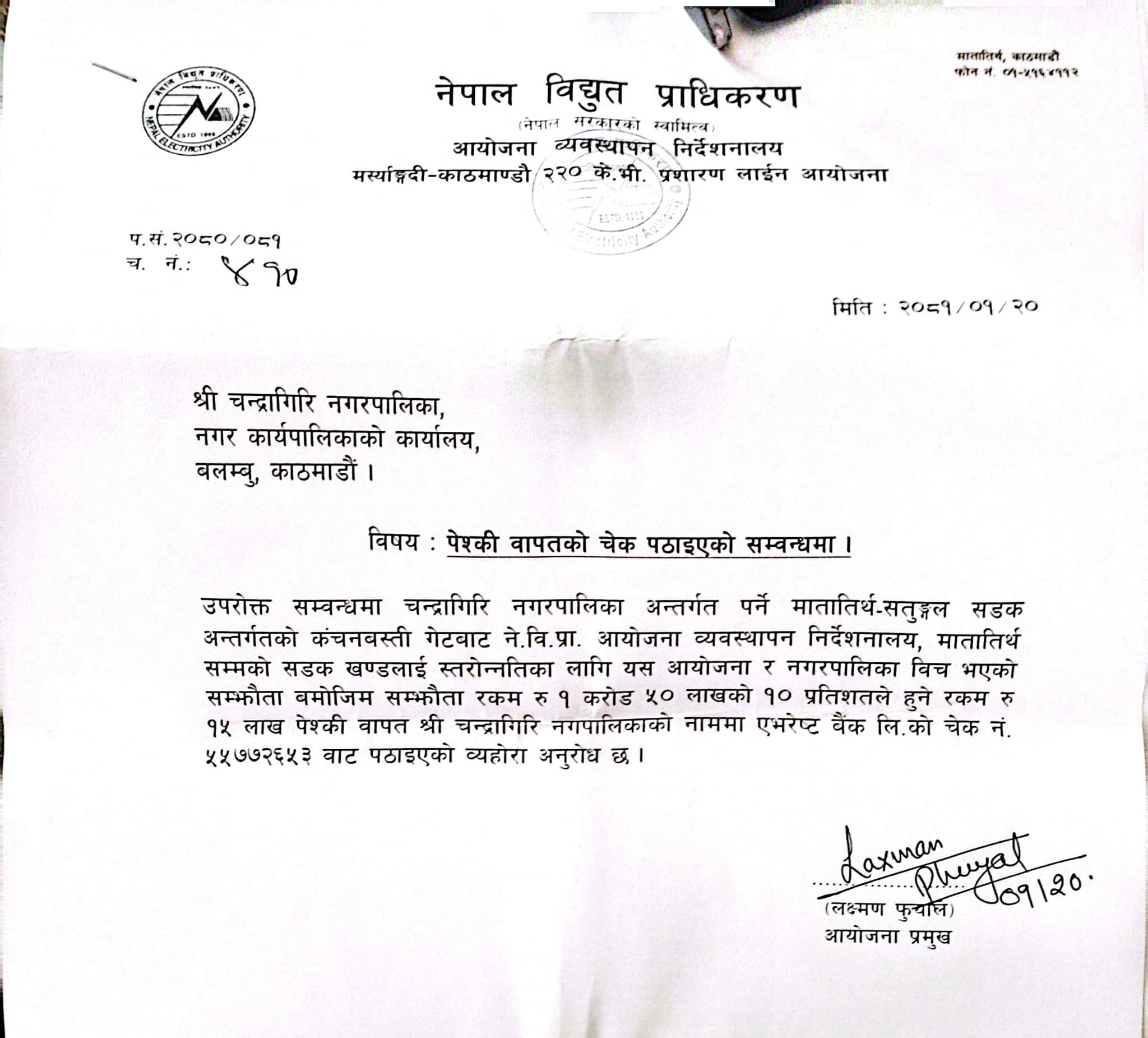 मातातिर्थ सडक स्तरोन्नतिका लागि विद्युत प्राधिकरणले चन्द्रागिरि नगरलाई डेढ करोड रूपैयाँ दिने