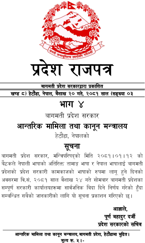 बागमती मन्त्रिपरिषद्को बैठकले प्रदेशमा सरकारी काम काजको भाषा प्रयोगमा ल्याउने क्रममा आज प्रदेशभर सार्वजनिक बिदा दिने निर्णय गरेको छ ।