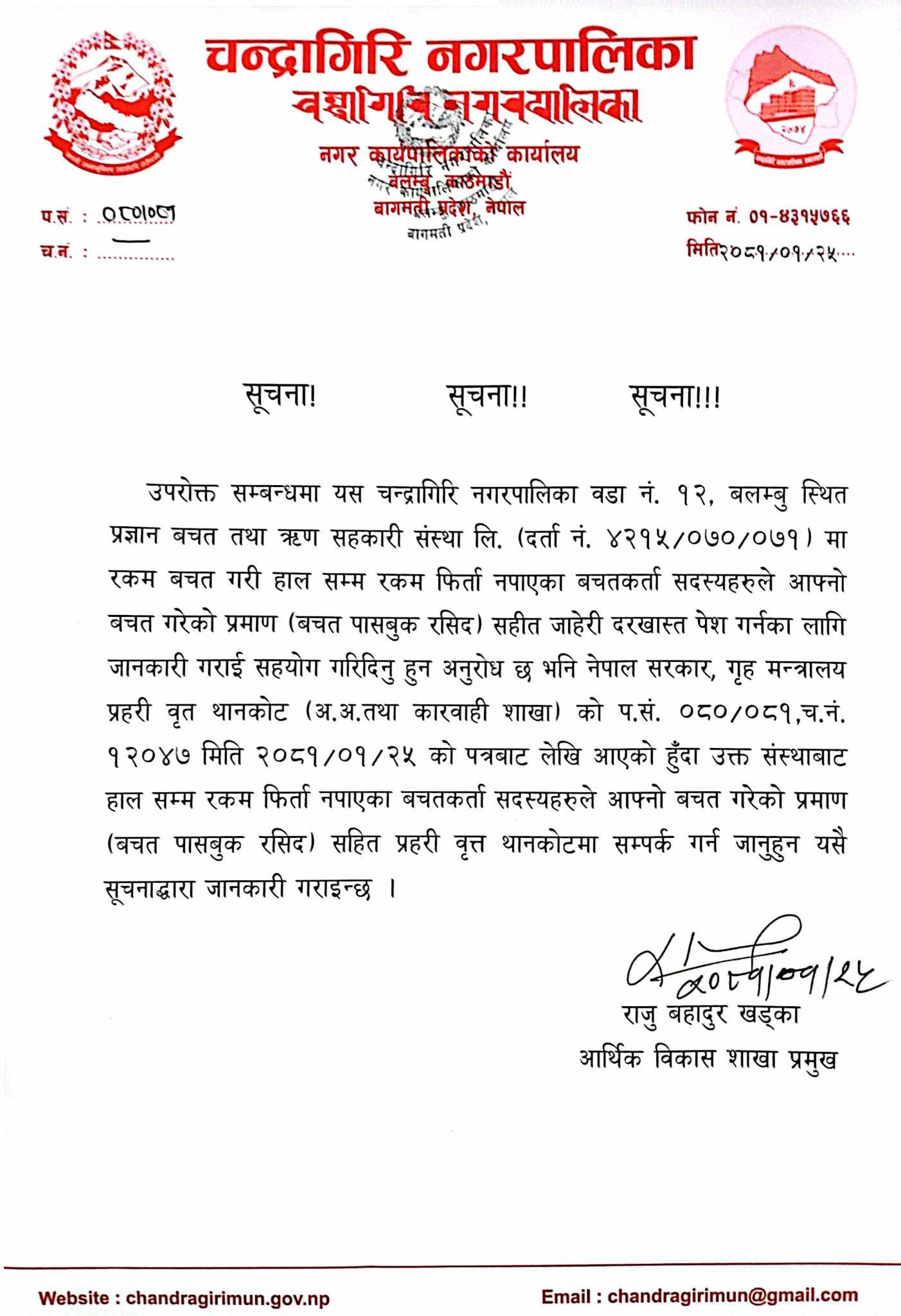 मंगलबार एक सूचना जारी गर्दै नगरको आर्थिक विकास शाखाले हालसम्म रकम फिर्ता नपाएका सम्बन्धित बचत कर्ताहरूले थानकोटस्थित प्रहरी वृत्तमा बचत पास बुकको रसिद प्रमाण साथमा लिइ जाहेरी दिन सकिने जनाएको छ ।
