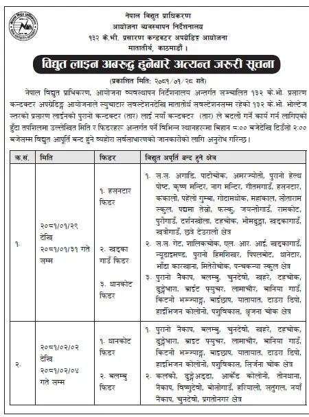 नेपाल विद्युत प्राधिकरण १३२ केभी प्रसारण कन्डक्टर अपग्रेडिङ आयोजना मातातिर्थका अनुसार आज चन्द्रागिरि नगरका पुरानो नैकाप, बलम्बु, चुनदेवी, खहरे दहचोक, ढुङ्गेअड्डा, ब्राइट फ्यूचर, बानियाँ गाउँ, किटनी भञ्ज्याङ, बाइछाप, यातायात कार्यालय, दाउरा डिपो, हाइभिजन कोलोनी, पशु विकास कार्यालय क्षेत्र, सृजना चोक लगायका क्षेत्रमा आज बिहान ८ बजेदेखी दिउँसो २ बजेसम्म विद्युत सेवा अवरुद्ध हुनेछ ।