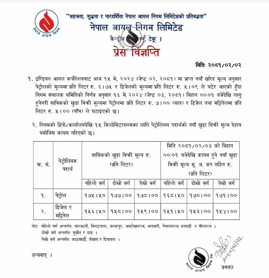निगमले पेट्रोलको मूल्य प्रतिलिटर ७ रुपैयाँ र डिजेल र मट्टितेलको मूल्य प्रतिलिटर ५ रुपैयाँले घटाएको एक विज्ञप्तिमार्फत जानकारी दिएको छ ।