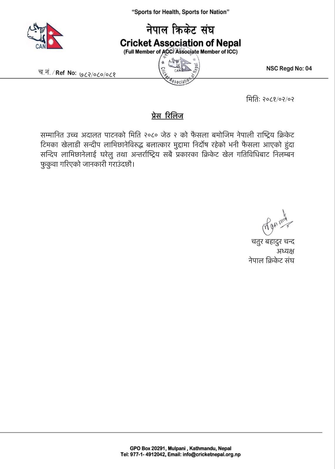 नेपाल क्रिकेट संघ (क्यान) ले क्रिकेटर सन्दीप लामिछानेमाथिको निलम्बन फुकुवा गरेको छ ।
