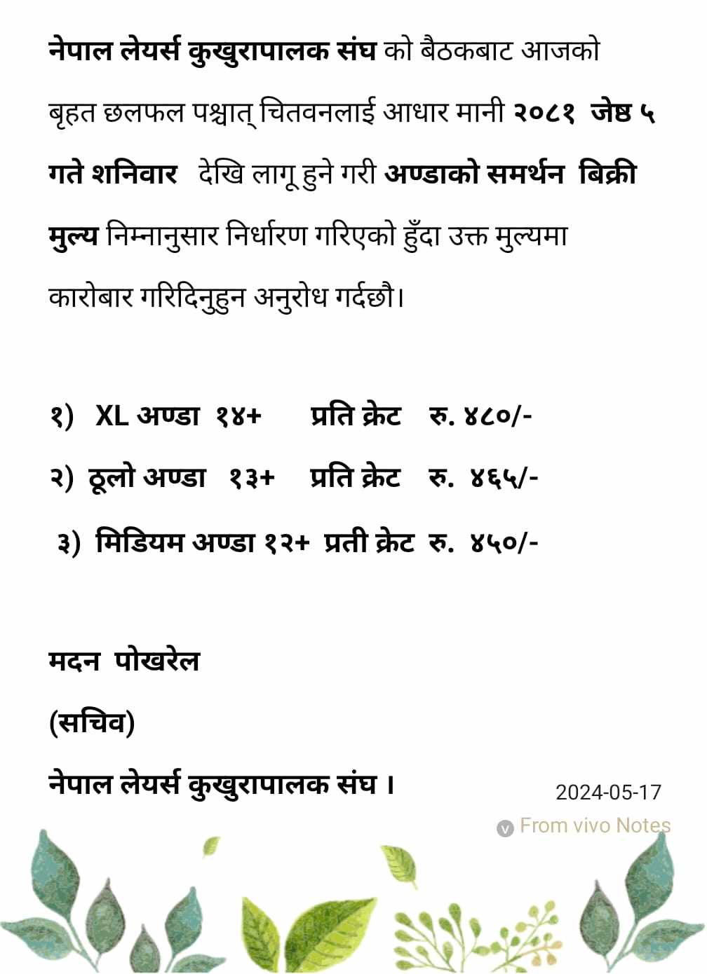 संघका अनुसार नयाँ मूल्य मिडियम साइजको अण्डा प्रतिक्रेट ४५० रुपैयाँ पर्नेछ । यस्तै, ठुलो अण्डा प्रतिक्रेट ४६५ रुपैयाँ र सबैभन्दा ठुलो अण्डा प्रतिक्रेट ४८० रुपैयाँ पर्नेछ ।
