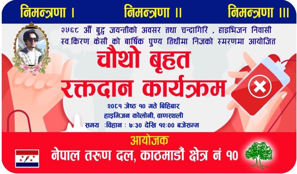 दिवंगत किरण केसीको स्मृतिमा भोलि बिहीबार चन्द्रागिरि नगरपालिका-७ चेकपोष्ट वाणस्थलीमा रक्तदान शिविर आयोजना हुने भएको छ ।