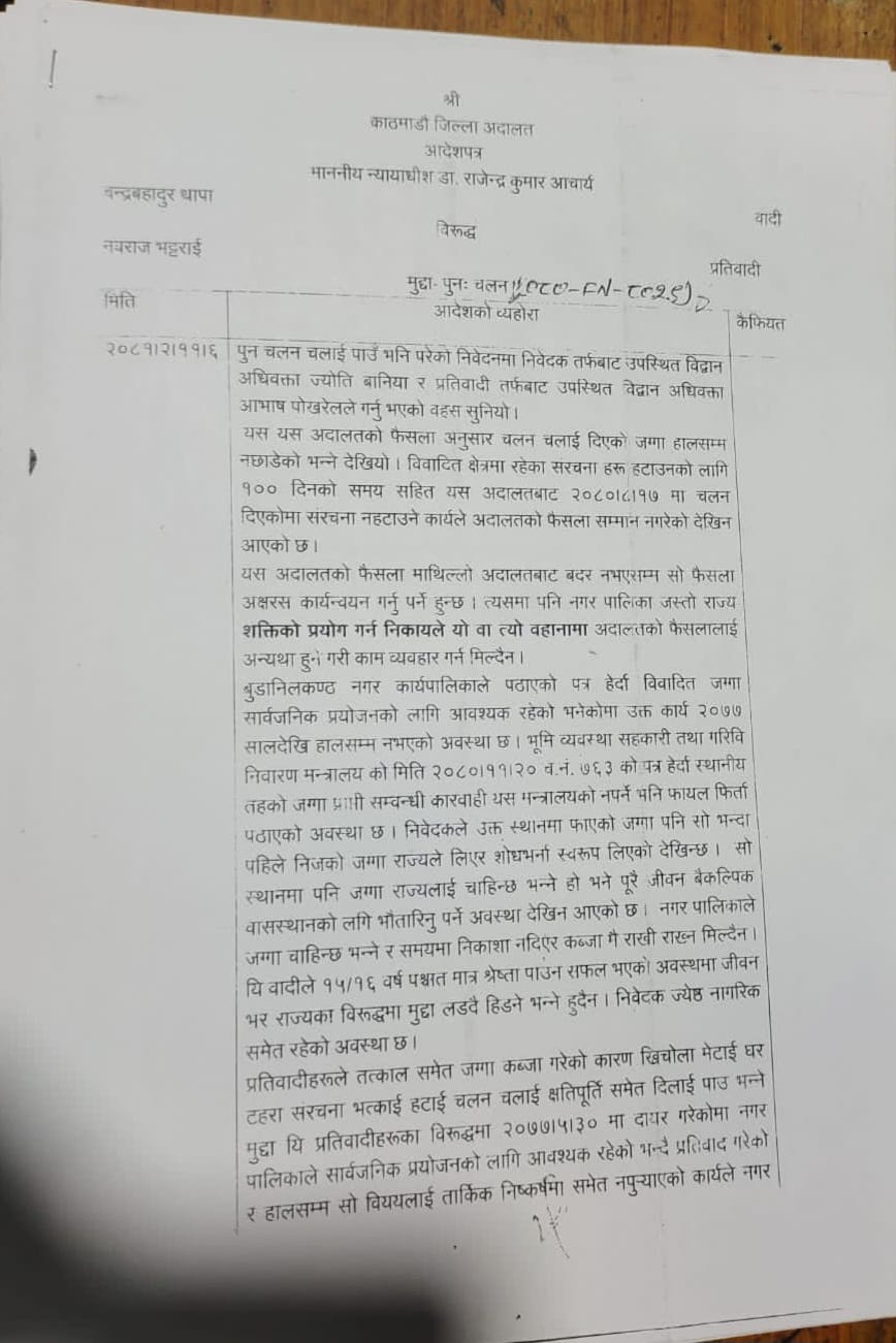 अदालतले चलन चलाइदिनू भनेको जग्गासमेत नगरपालिकाले आफ्नो कब्जामा राखिराखेको भन्दै न्यायाधीश डा. राजेन्द्रकुमार आचार्यको इजलासले यसलाई अदालतको अवहेलना भनेको छ ।