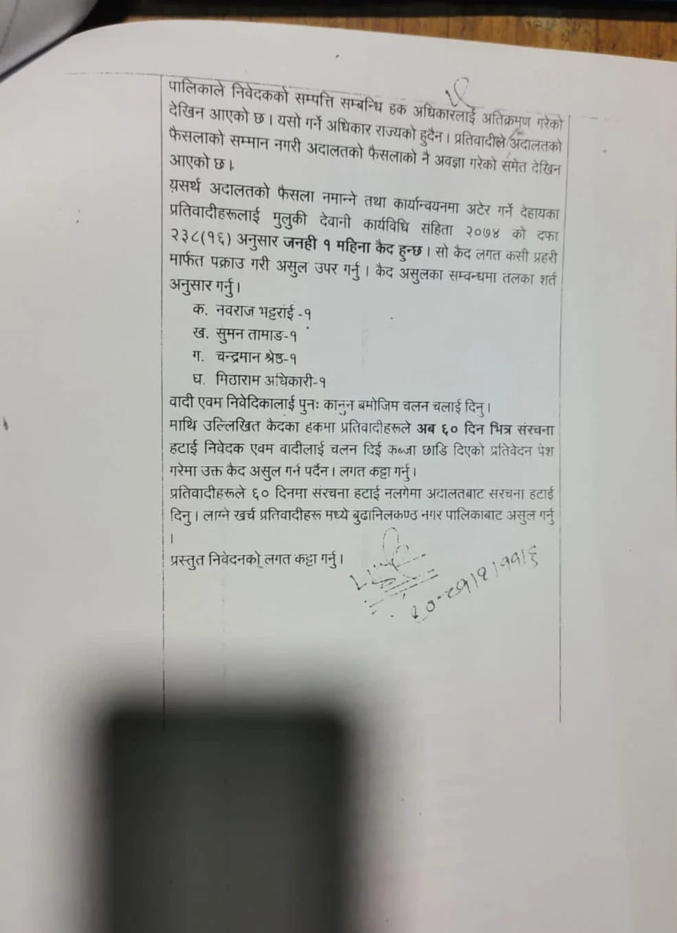 अदालतको अवहेलनामा मेयर अधिकारीसँगै वडा नं १० का वडाध्यक्ष नवराज भट्टराई, वडा नं ८ का वडाध्यक्ष सुमन तामाङ र वडा नं १० का वडासदस्य चन्द्रमान श्रेष्ठलाई १ महिना कैदको आदेश सुनाइएको हो ।