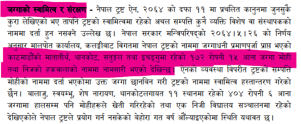 यसैगरी बालाजु, स्वयम्भु, शेषनारायण, थानकोटलगायत ११ स्थानमा रहेको ४०४ रोपनी ६ आना जग्गामा हालसम्म पनि मोहीहरुले खेती गरिरहेको तथा एक निजी विद्यालय सञ्चालनमा रहेको देखिएकोले नेपाल ट्रस्टले प्रयोग गर्न नसकेको कार्यालयले जनाएको छ।