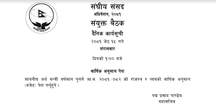 अर्थमन्त्री वर्षमान पुनले बजेट सार्वजनिक गर्ने कार्यतालिका रहेको छ।