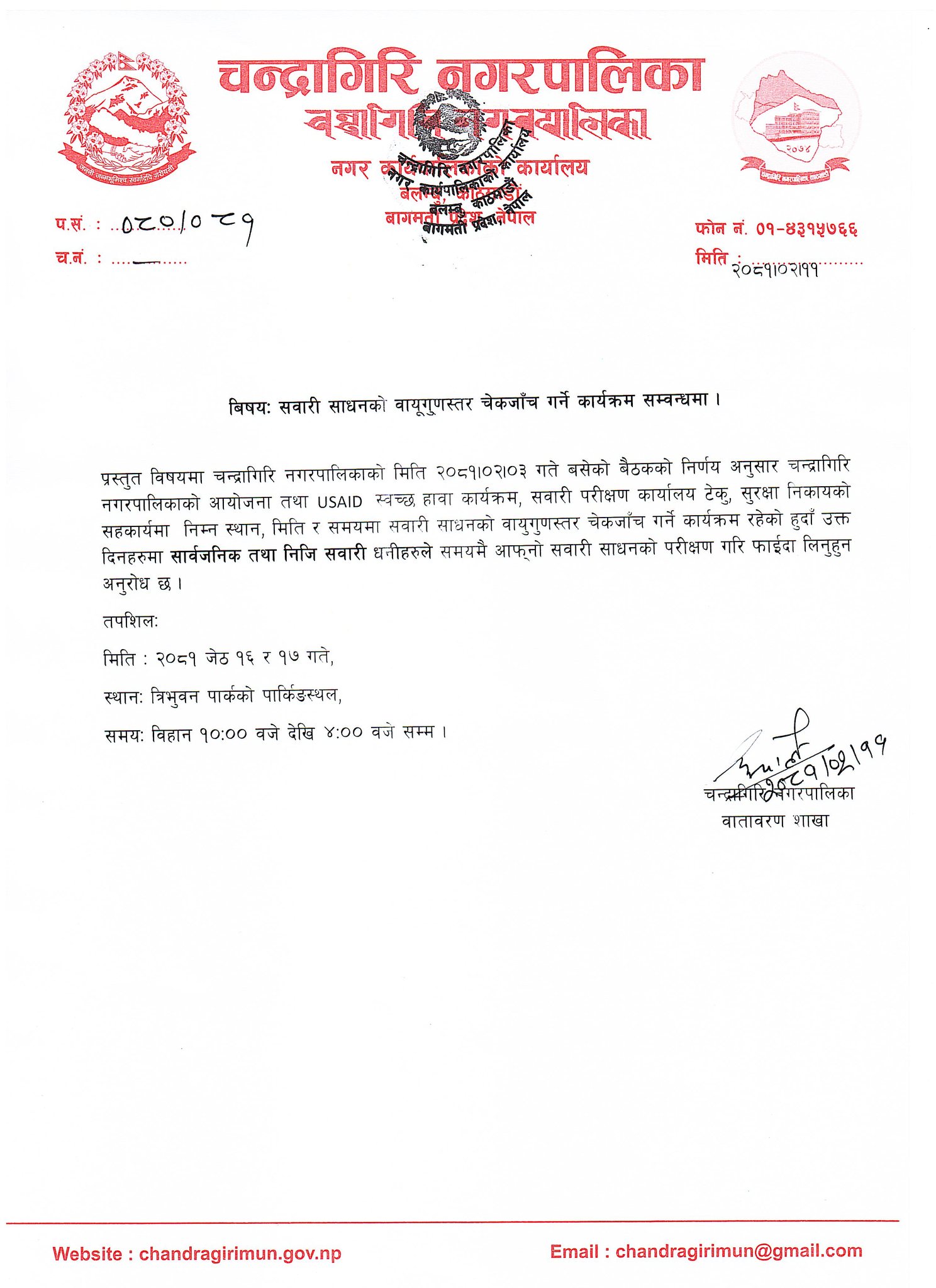 अमेरिकी सहयोग नियोग यूएसआइडीको स्वच्छ हावा कार्यक्रम, सवारी परीक्षण कार्यालय टेकुसँगको सहकार्यमा चन्द्रागिरि नगरपालिकाले आज जेठ १६ र भोलि जेठ १७ गते सार्वजनिक तथा नीजि सवारीसाधनको वायु गुणस्तर परीक्षण गर्न लागेको हो ।