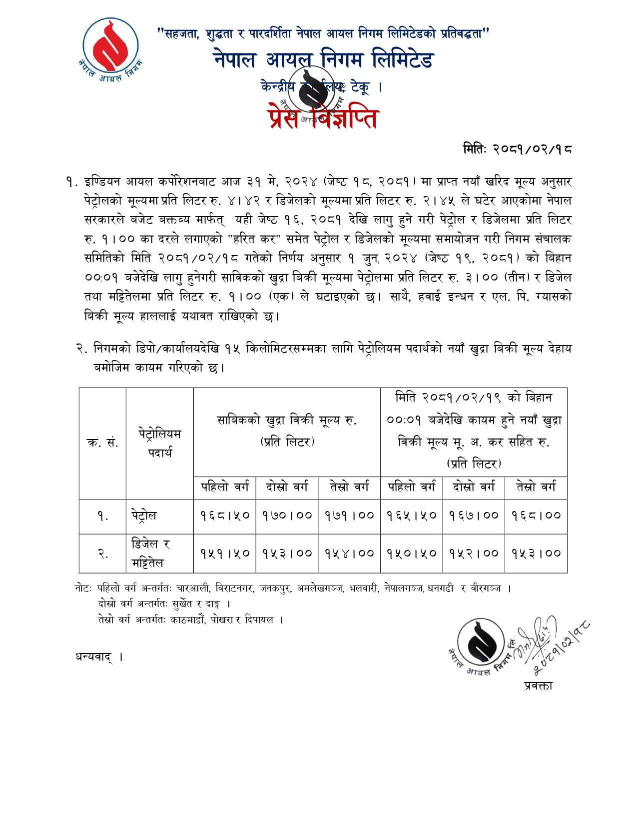 निगमले पेट्रोल र डिजेलको मूल्य घटाएको हो ।  आज राति १२ बजेदेखि लागु हुनगेरी निगमले पेट्रोल मूल्य प्रतिलिटर ३ रुपैयाँ र डिजेलको मूल्य प्रतिलिटर एक रुपैयाँले घटाएको हो ।