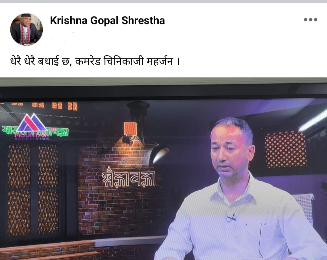 सामाजिक सञ्जाल फेसबुकमा साेमबार काठमाडौं महानगरपालिका वडा नम्बर २२ का वडाध्यक्ष चिरीकाजी महर्जनको तस्बिर राख्दै सांसद श्रेष्ठले बधाई दिएका छन् ।