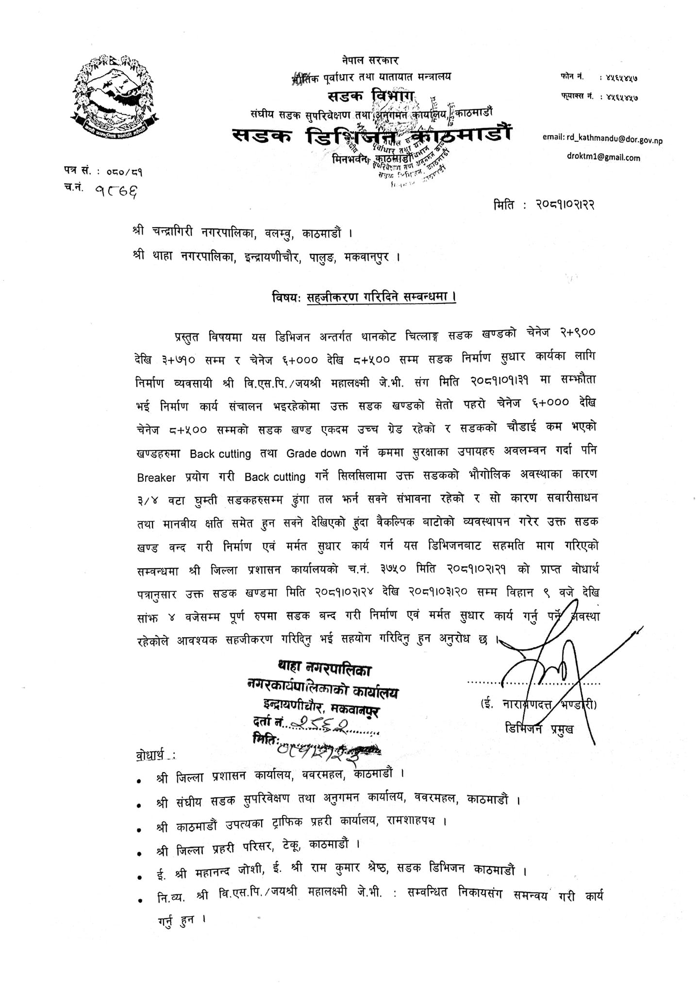 सडक डिभिजन कार्यालय काठमाडाैंले जिल्ला प्रशासन कार्यालयबाट माग भए बमोजीम सूचना जारी भएको समेत जानकारी दिएको छ ।