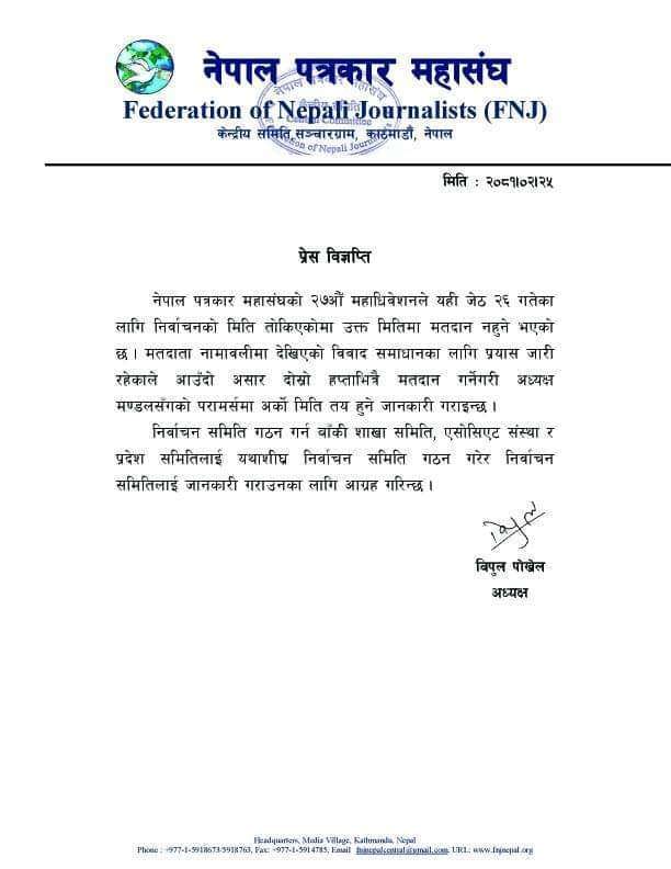 विज्ञप्तिमा भनिएको छ : ‘नेपाल पत्रकार महासंघको २७औँ महाधिवेशनले यहीँ जेठ २६ गतेका लागि निर्वाचनको मिति तोकिएकोमा उक्त मितिमा मतदान नहुने भएको छ । मतदाता नामावलीमा देखिएको विवाद समाधानका लागि प्रयास जारी रहेकाले आउँदो असार दोस्रो हप्ताभित्रै मतदान गर्नेगरी अध्यक्ष मण्डलसँगको परामर्शमा अर्को मिति तय हुने जानकारी गराइन्छ ।’