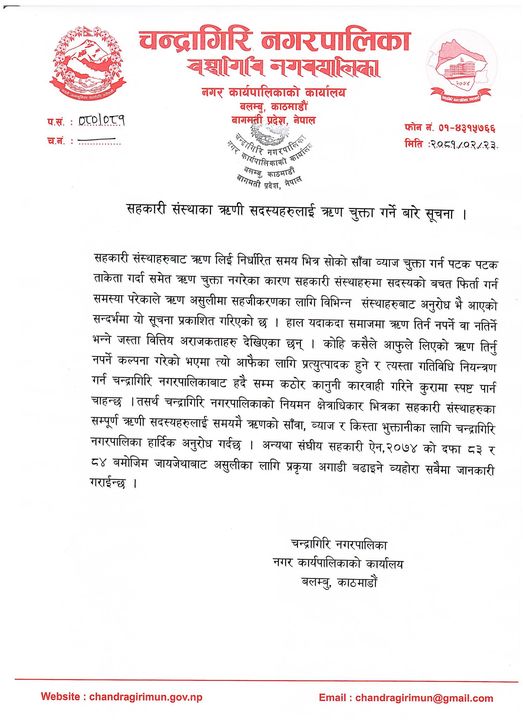 चन्द्रागिरि नगरपालिकाले सहकारीको ऋण तोकिएको समयमै चुक्ता गर्न ऋणीहरुलाई सजग गराएको छ ।
