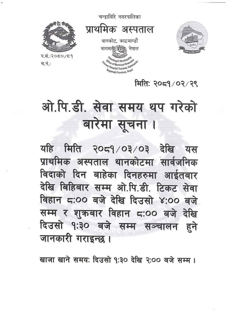 चन्द्रागिरि नगरपालिका-४ थानकोट गोदाममा रहेको नगर प्राथमिक अस्पतालमा बाहिर रोगी विभाग (ओपीडी) को समय थप गरिएको छ ।