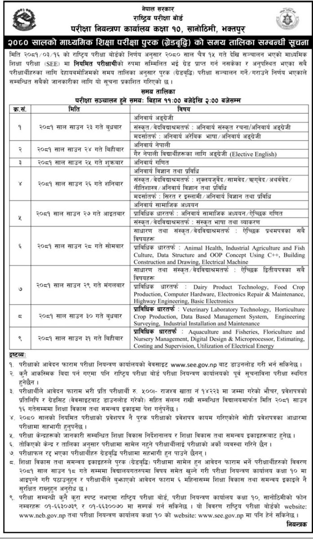 परीक्षा नियन्त्रण कार्यालय कक्षा १०, सानोठिमीले २०८० को माध्यमिक शिक्षा परीक्षा (एसइइ) को पुरक परीक्षा (ग्रेड वृद्धि) को समय तालिका सार्वजनिक गरेको छ ।