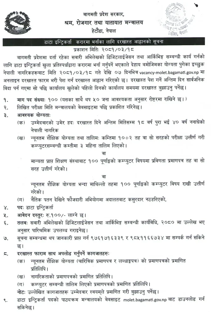 प्रदेशको श्रम, रोजगार तथा यातायात मन्त्रालयले अभिलेख डिजिटलाइज गर्न डाटा इन्ट्रिकर्ता भर्ना गरी प्रदेशमा दर्ता रहेका सवारी अभिलेखको डिजिटलाईजेसन प्रक्रिया अघि बढाउन लागेको हो । जसका लागि मन्त्रालयले मंगलबार १ सय जना कर्मचारी माग गर्दै सूचना जारी गरेको छ ।