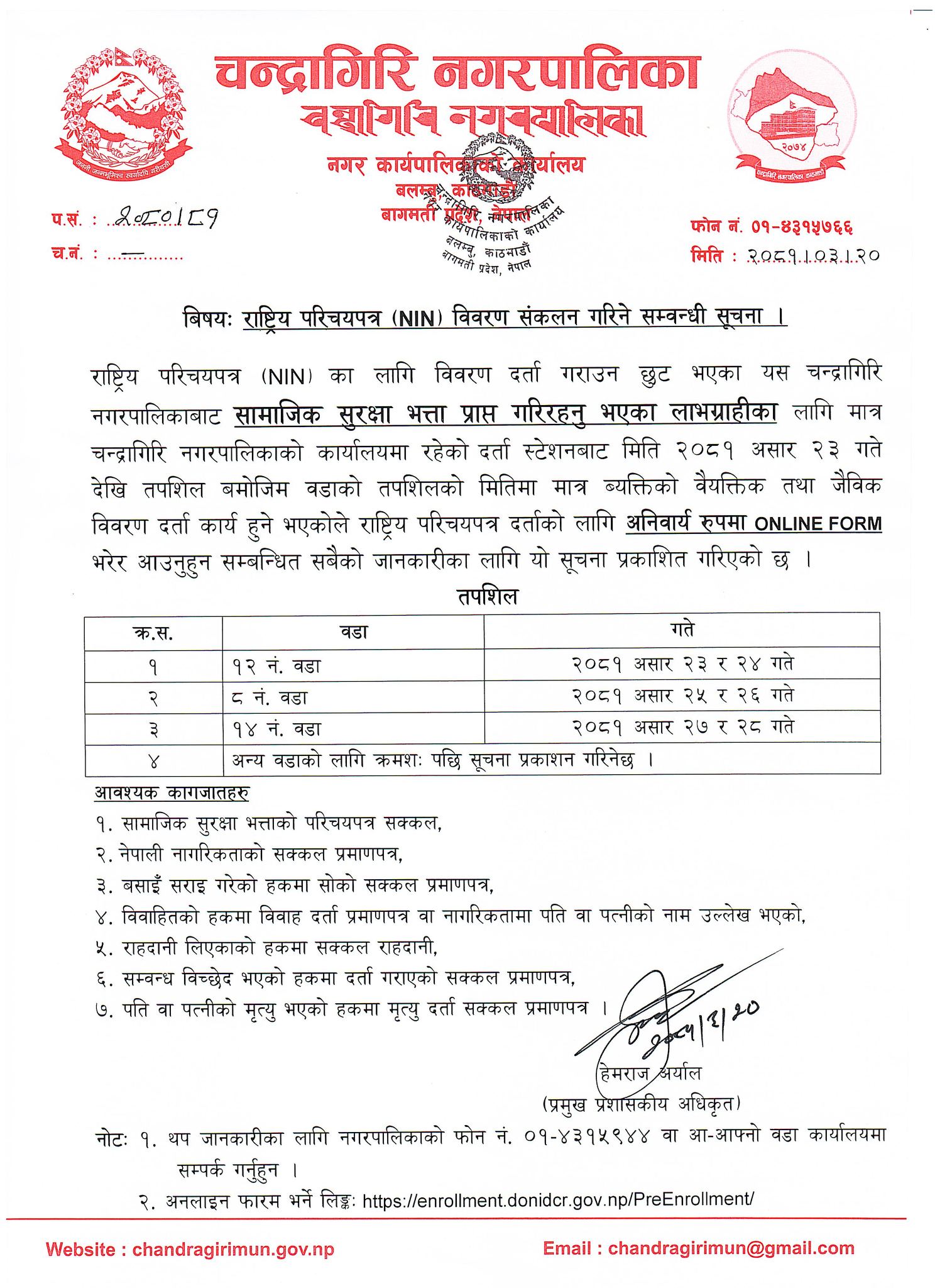 सामाजिक सुरक्षा भत्ता प्राप्त गरिरहेका तरा राष्ट्रिय परिचय पत्रका लागि विवरण दर्ता गराउन छुट भएका नगरबासीहरूका लागि लक्षित गरि चन्द्रागिरि नगरपालिकाले दर्ता प्रकृया सुरु गर्ने भएको छ ।