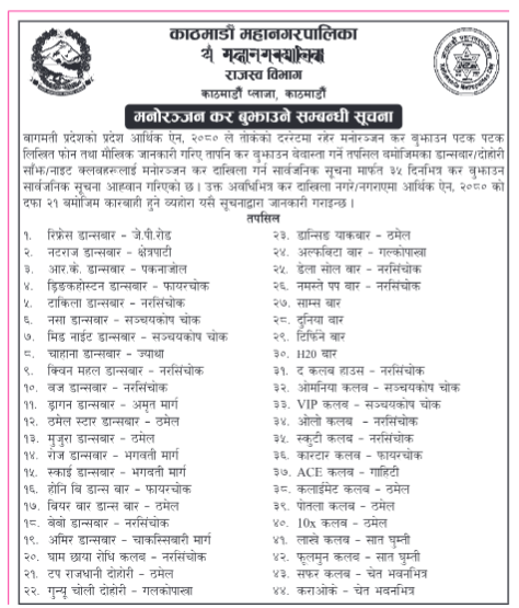 ३५ दिनभित्र मनोरञ्जन कर चुक्ता गर्न ४४ वटा दोहोरी तथा क्लबलाई काठमाडाैं महानगरको सूचना