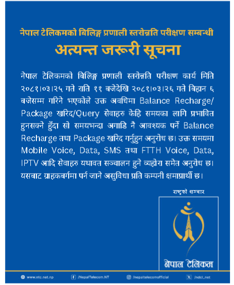 मंगलबार एक सूचना जारी गर्दै नेपाल टेलिकमले बिलिङ प्रणाली स्तरोन्नतिको परीक्षण कार्य हुने भएकाले आज राति ११ बजेदेखि भोलि बिहान ६ बजेसम्म रिचार्ज र डाटा प्याकेज खरिदका सेवाहरु प्रभावित हुन जनाएको हो।