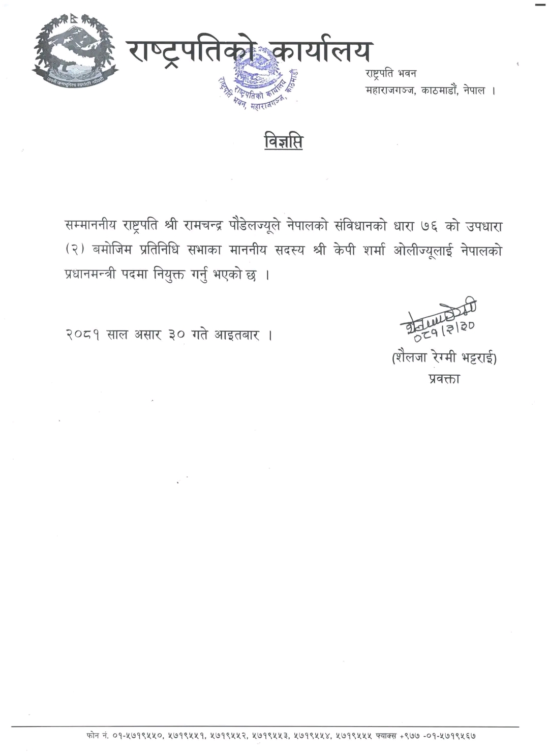 प्रधानमन्त्री नियुक्त भएका ओलीको भोलि बिहान ११ बजे शपथको कार्यक्रम तय भएको छ ।