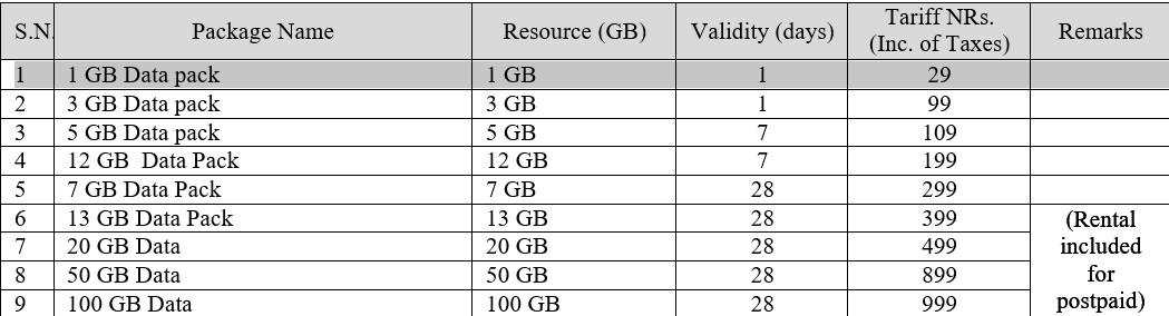 डाटा प्याक अन्तर्गत १ दिन देखि २८ दिनसम्म समयावधि रहेका २९ रुपैयाँ देखि ९९९ सम्मका १ जीबी देखि १०० जीबी सम्म रिसोर्स सहितका विभिन्न आकर्षक डाटा प्याकहरू उपलब्ध हुनेछन् ।