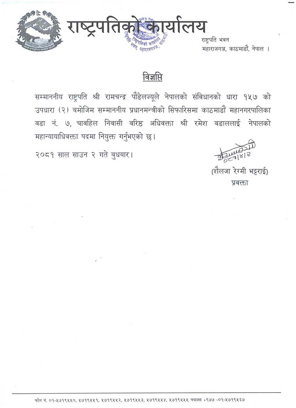 प्रधानमन्त्री केपी शर्मा ओलीको सिफारिसमा राष्ट्रपति रामचन्द्र पौडेलले बडाललाई महान्यायाधिवक्तामा नियुक्त गरेको राष्ट्रपतिको कार्यालयले जानकारी दिएको छ ।