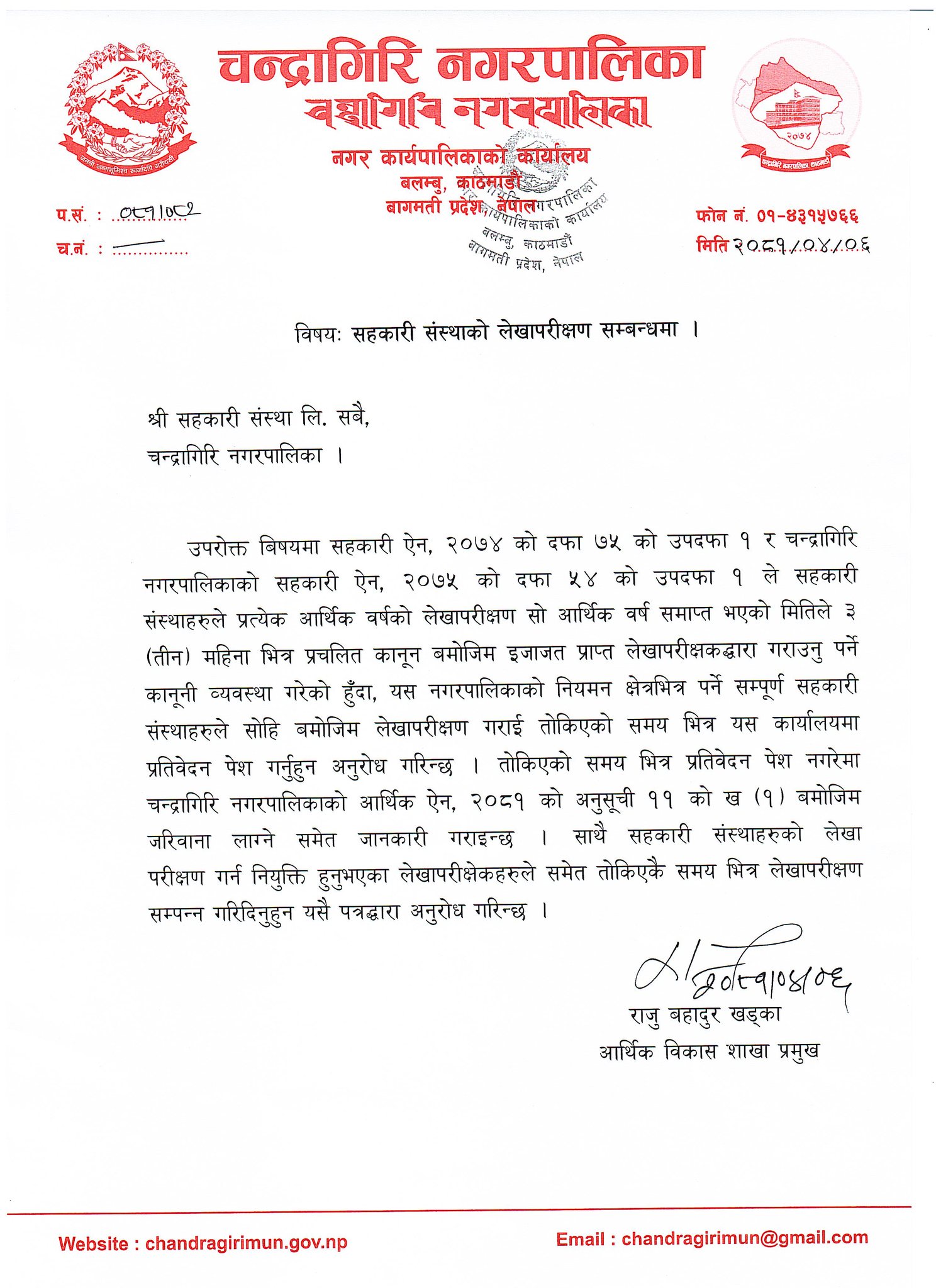 सहकारीहरूलाई तीन महिनाभित्र लेखापरिक्षण प्रतिवेदन बुझाउन चन्द्रागिरि नगरको निर्देशन